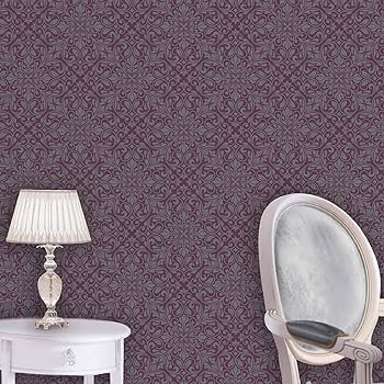 Features an embossed baroque pattern in a grey with glitter details throughout, finish on a metallic Aubergine background, for truly breathtaking wallpaper.